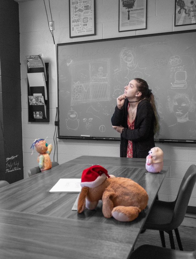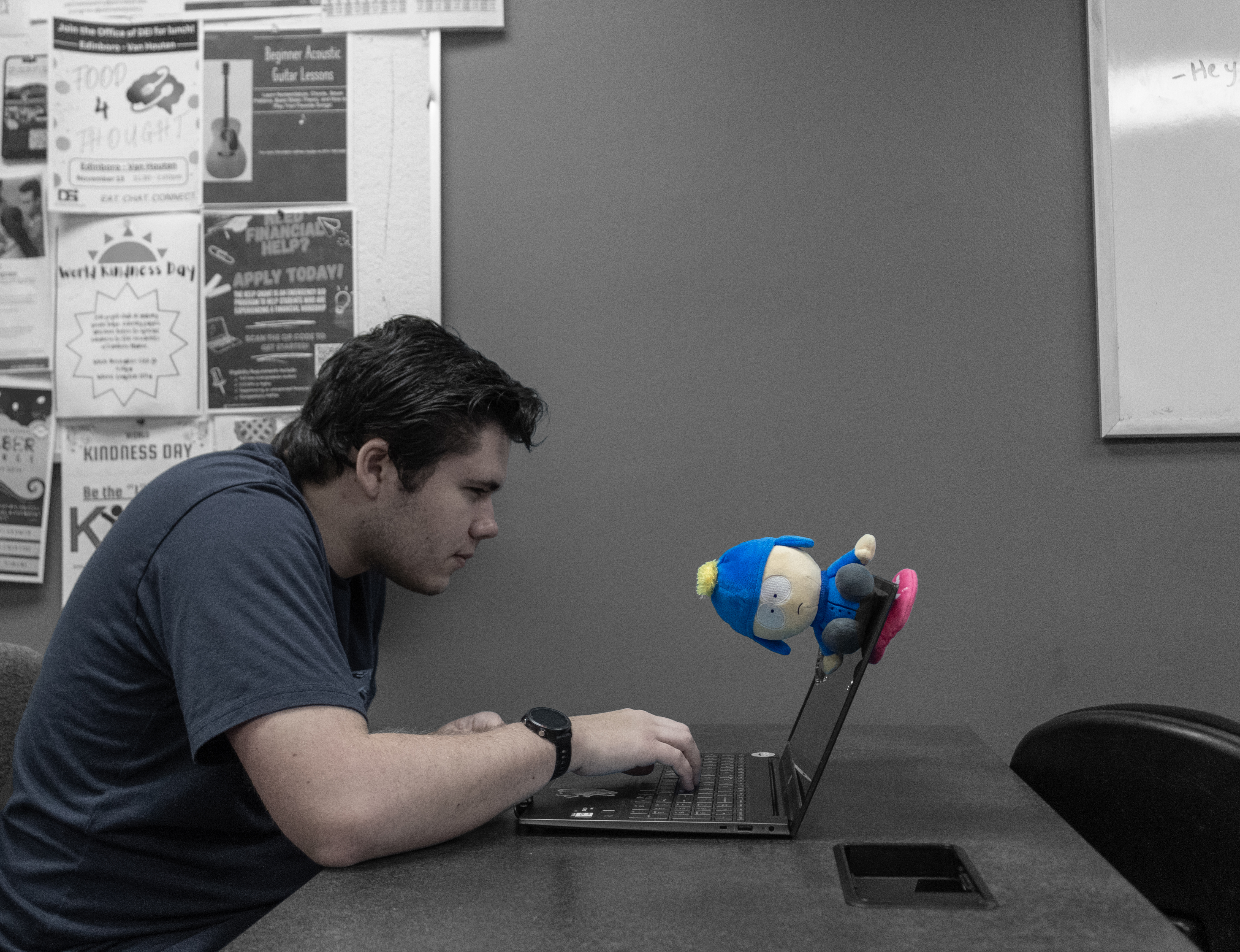 A personal narrative about adulthood, emotional repression and plush toy collector phenomenon. This project was created as the final assignment for my introductory photography class. The plush toys featured are personal to each model. The models are posed doing work relating to their college major. All post production was done in Adobe Photoshop. I hope to revisit this concept and flesh it out in some of my future work.